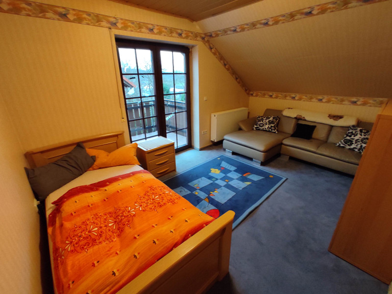 Dachgeschosswohnung mit Küche (komplett eingerichtet); großes Wohnzimmer mit Einzelbett, SAT-TV, WLAN, Mikrowelle, Föhn, Nichtraucher, keine Haustiere, Parkplatz, Radfahrer und Monteure willkommen